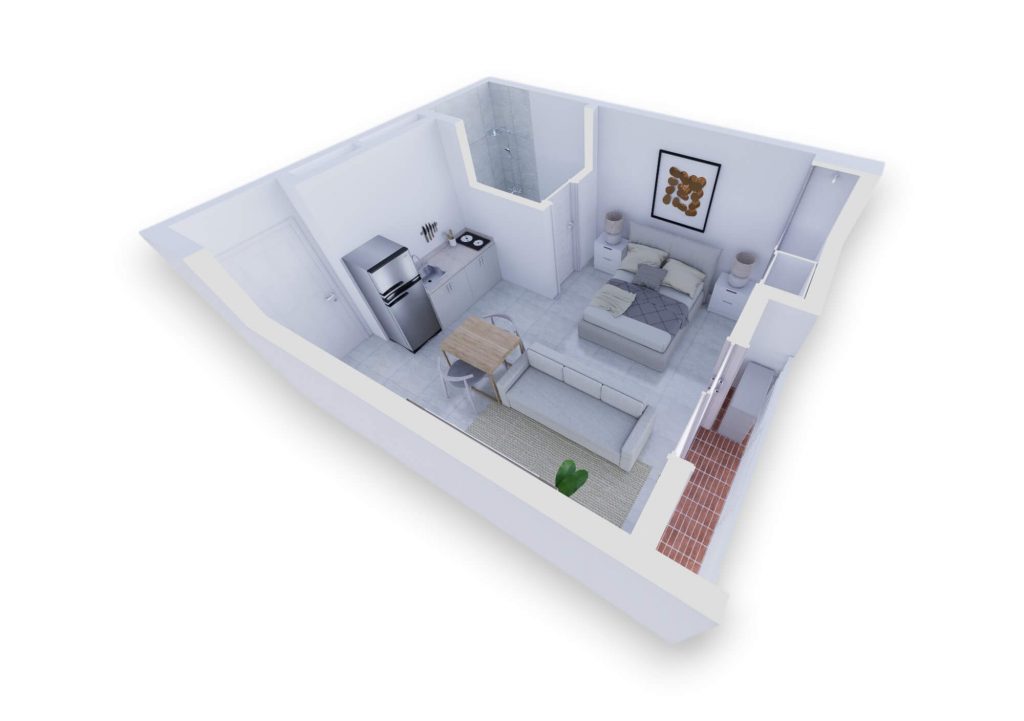 Distribución: Cocina, Sala / Dormitorio, Baño y Balcón.