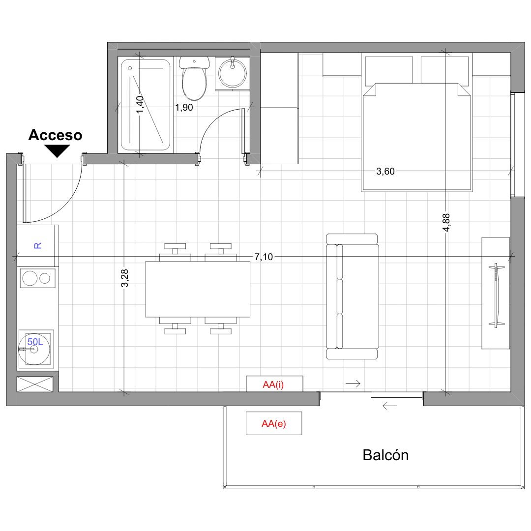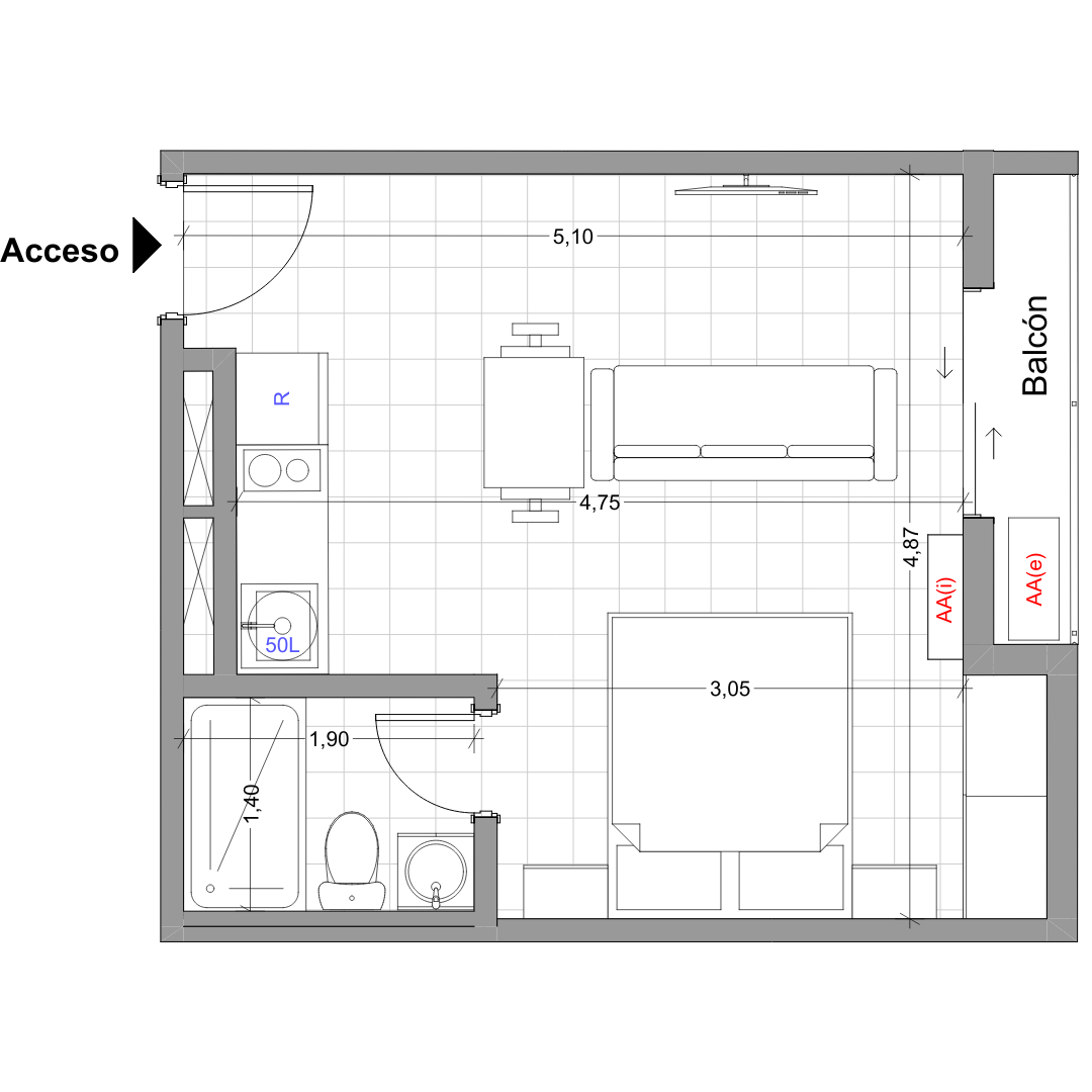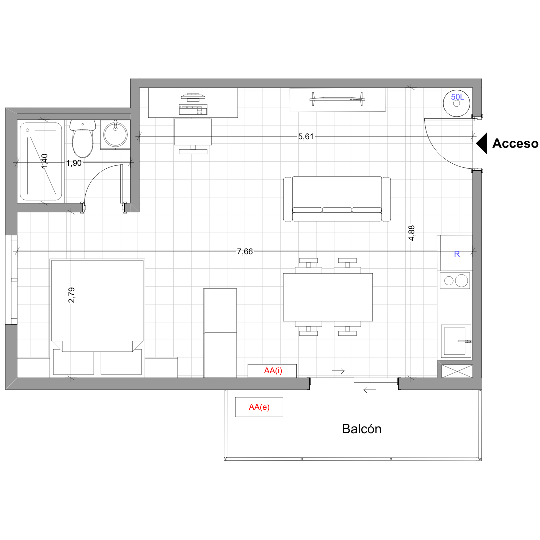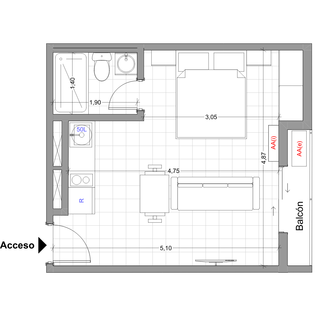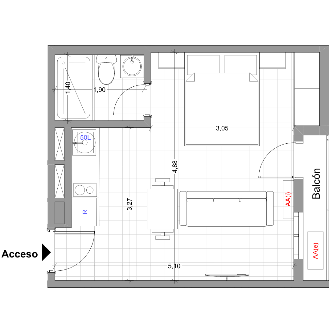 Distribución: Cocina / Sala / Comedor, Dormitorio, Baño y Balcón