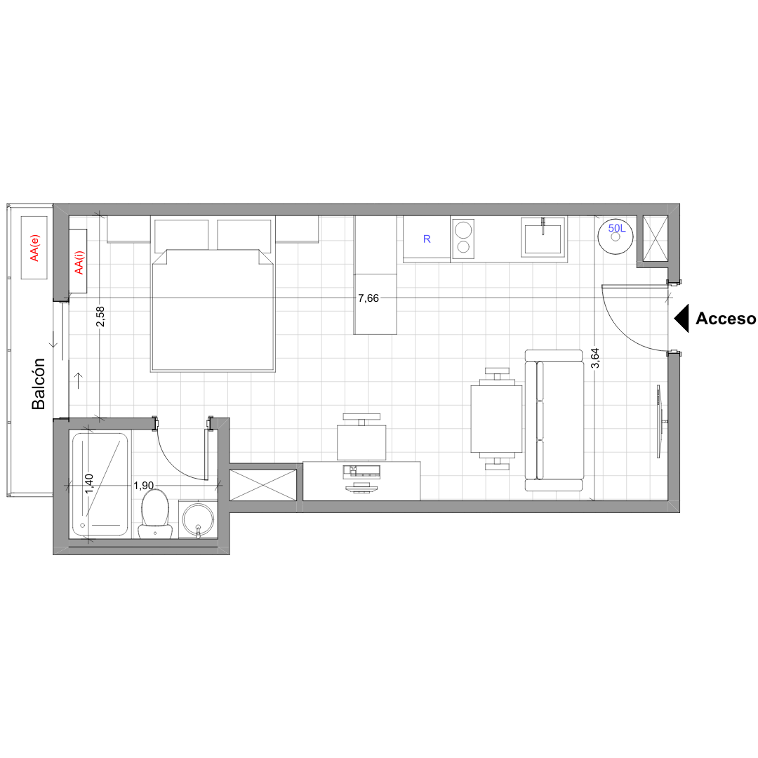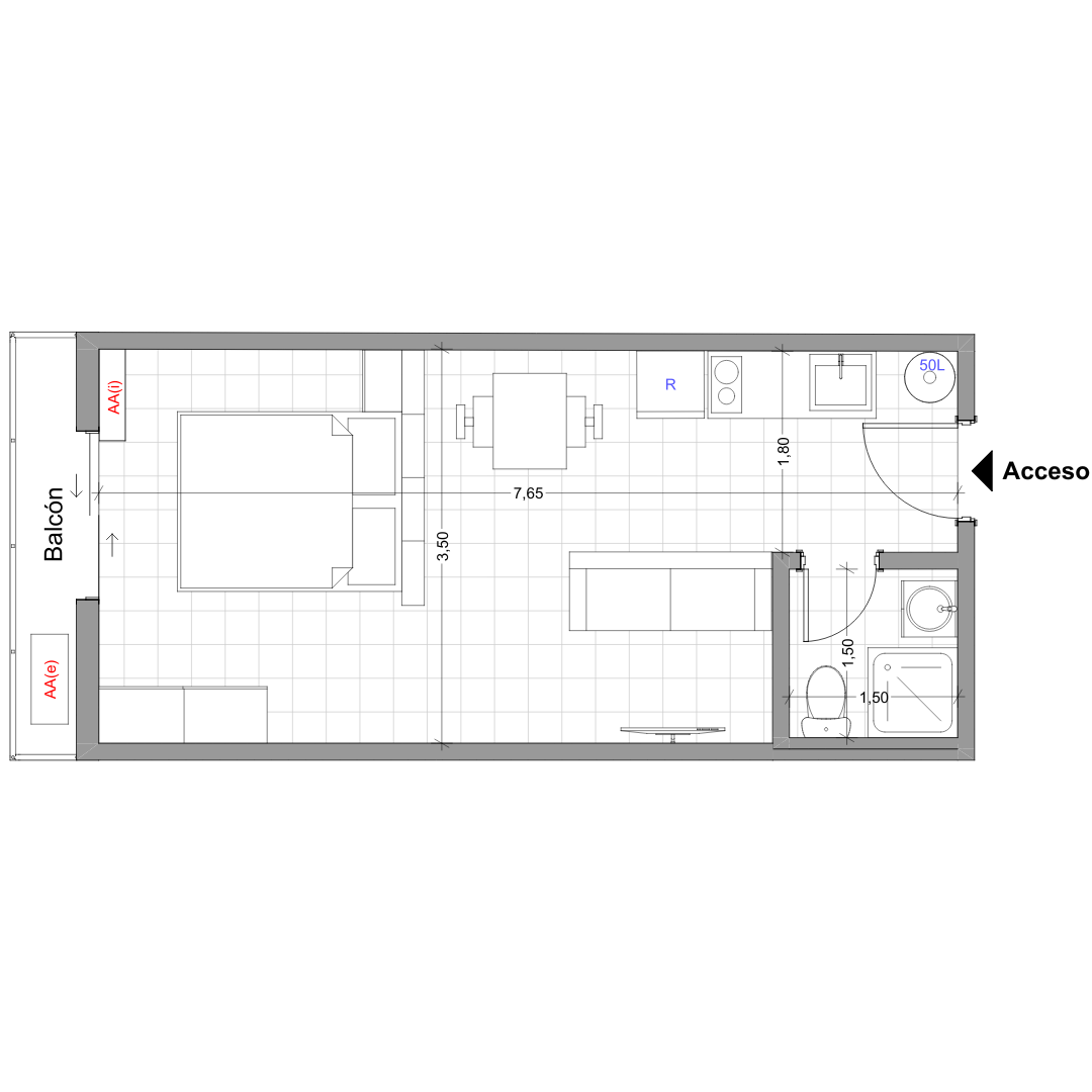 Distribución: Sala / Comedor / Cocina, Dormitorio, Baño y Balcón